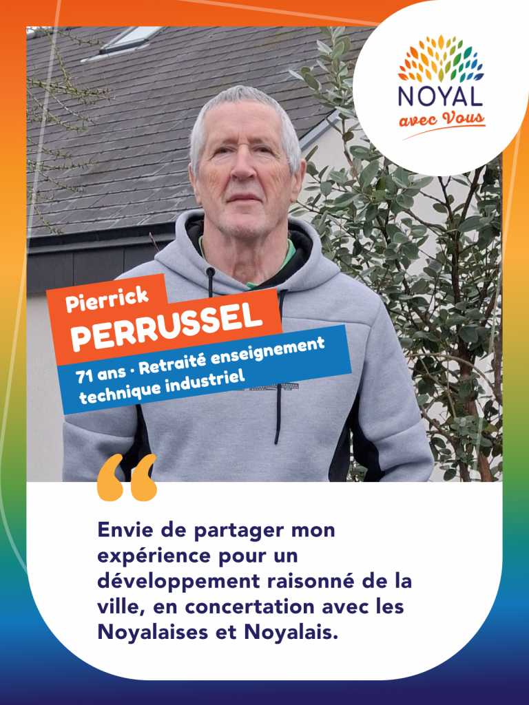 Pierrick est Noyalais depuis 16 ans. Il cumule 50 années de bénévolat associatif et sportif. Très engagé collectivement, Pierrick a envie de partager son expérience technique, associative et sportive, pour un développement raisonné de la ville, en concertation avec les Noyalais.